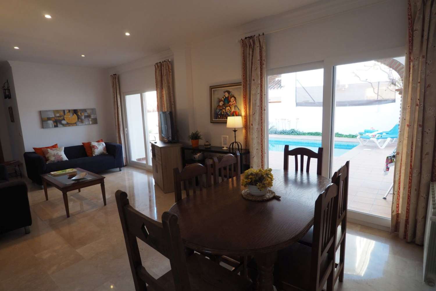 Living room with sitting area and satellite TV, CD, DVD, air conditioning and free internet. There is also a dining area. Through sliding doors you can go to the garden with private pool.