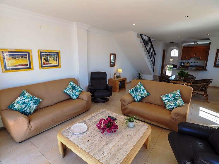 El salón es luminoso y tiene vistas al mar. Hay una zona de estar con TV vía satélite, DVD y equipo de música. Hay una zona de comedor para 6 personas. A través de puertas correderas se puede acceder a la terraza con vistas al mar. WIFI