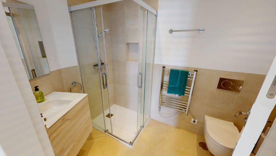 Tilavassa päämakuuhuoneessa on oma kylpyhuone ja suora pääsy parvekkeelle. Tästä makuuhuoneesta voi nauttia kauniista merinäkymästä. Lisäksi on toinen makuuhuone ja perhekylpyhuone, jossa on sekä suihku että kylpyhuone.
