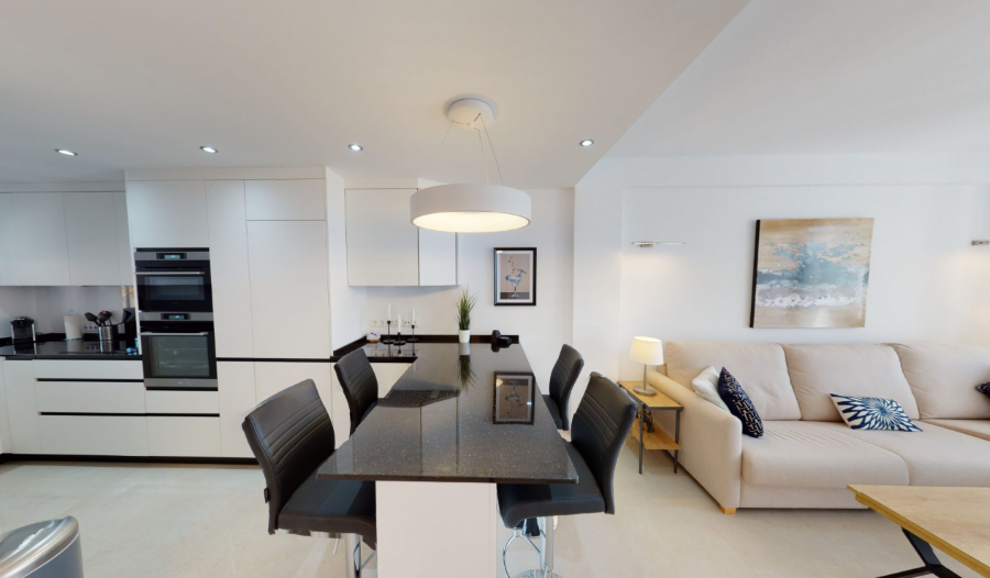 Talossa on valoisa olohuone avoimella keittiöllä. Olohuoneesta on suora pääsy katetulle terassille, joka on suunnattu länteen ja josta avautuu näkymät sekä merelle että uima-altaalle — täydellinen ilta-auringon nauttimiseen.