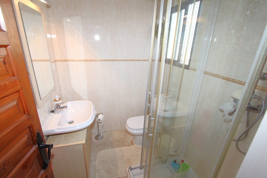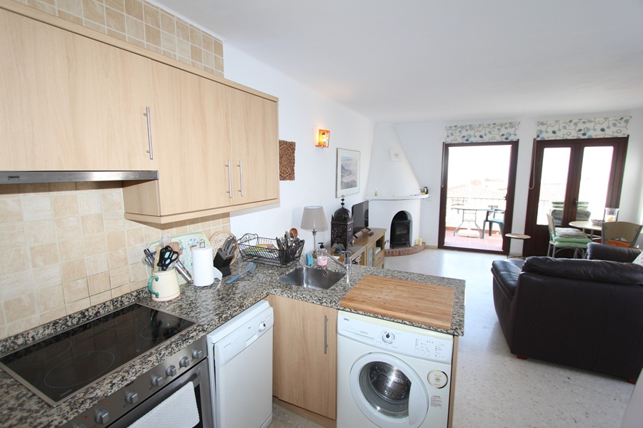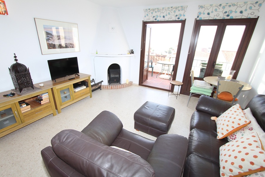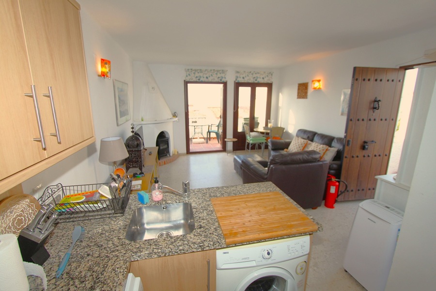 Taloon pääsee viehättävän puutarhan ja lyhyiden portaiden kautta. Sisällä pääset avoimeen ja valoisaan oleskelutilaan, jossa on moderni, täysin varustettu keittiö ja viihtyisä olohuone, jossa on takka. Suuret terassiovet yhdistävät olohuoneen terassiin, jotta sisä- ja ulkopuoli sulautuvat kauniisti toisiinsa.