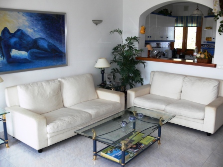 Lichte ruime woonkamer met flatscreen sat.tv, cd-speler en open haard. Middels openslaande tuindeuren toegang tot het terras met zeezicht. Hier staat een rieten 4 persoons eettafel.