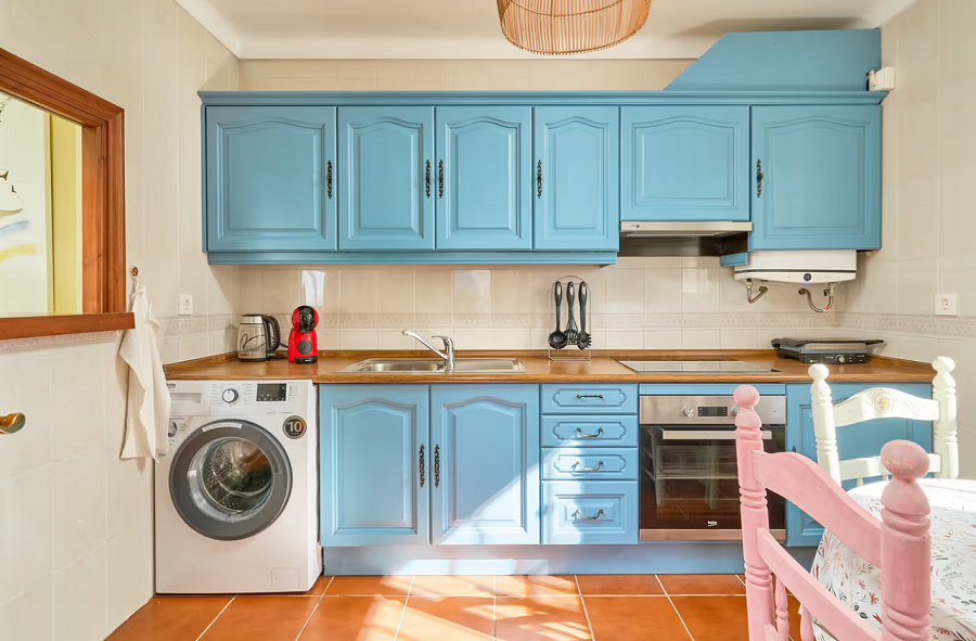 Keuken met 4-pits keramische kookplaat, oven, koel-vriescombinatie, wasmachine, koffiezetapparaat en waterkoker. Er is een kleine ontbijttafel