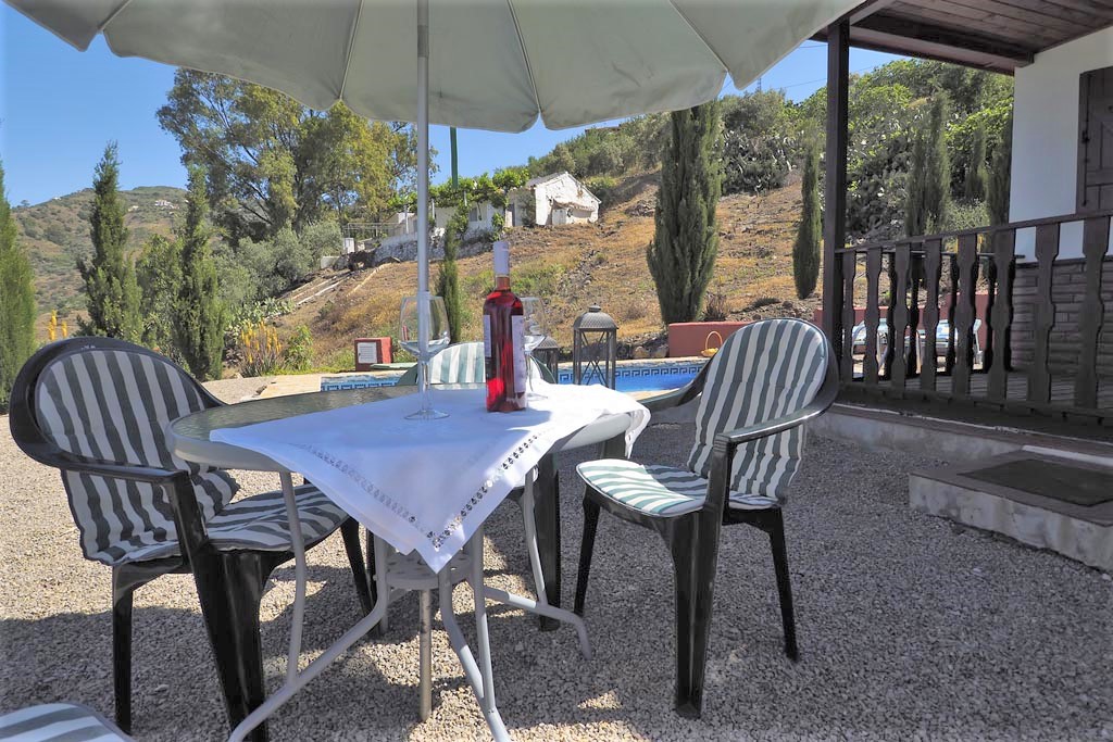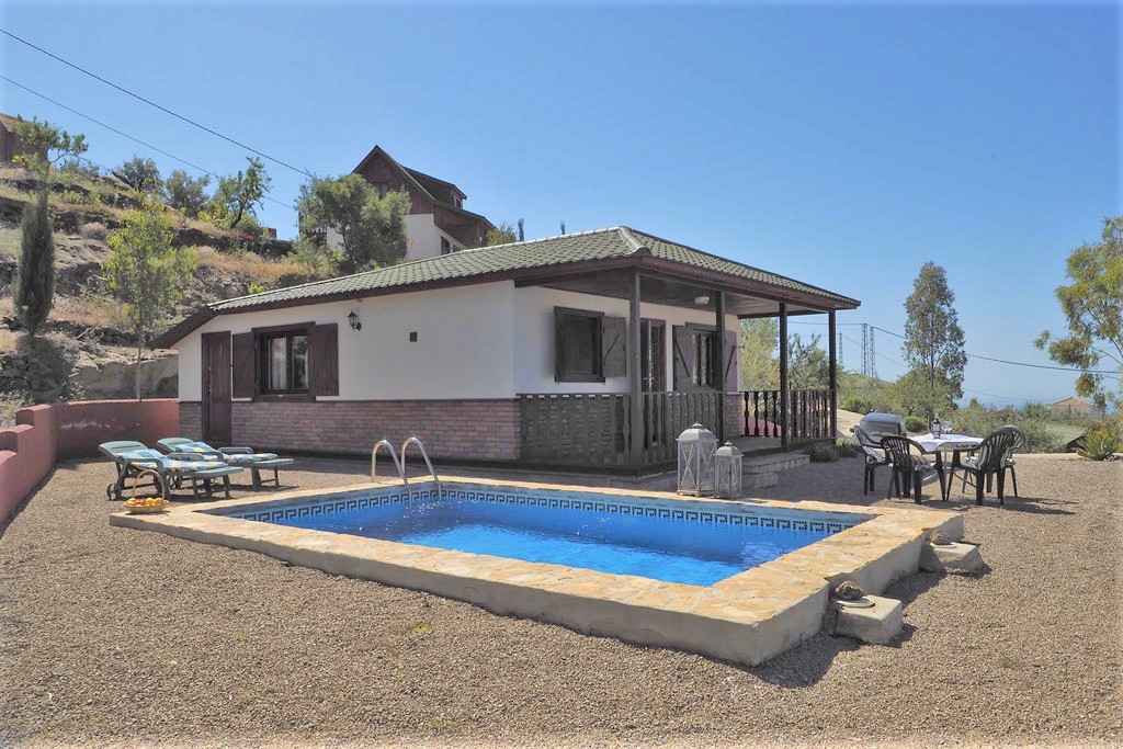 Vackert fristående fritidshus i Algarrobo med vacker utsikt över havet och bergen. Du kan njuta av lugnet och tystnaden här som om du befann dig i det riktiga inlandet av Andalusien, men du hittar stranden och havet på 6 km. Planlösning: Vardagsrum med sat.tv. Kök Kyl/frys, extra kyl, keramikhäll med 2 plattor, mikrovågsugn, tvättmaskin och kaffebryggare. Sovrum med två enkelsängar. Sovrum med dubbelsäng. Badrum med dusch, toalett och handfat. Utanför Stor trädgård med privat pool på 6 x 3 meter. Täckt terrass och fin utsikt över havet. Det finns en grill och trädgårdsmöbler. Parkering på privat egendom.